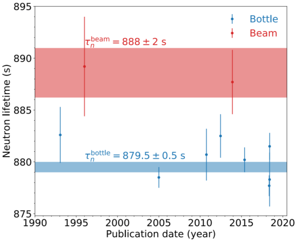 Από την δεκαετία του 1980 τα αποτελέσματα των δυο πειραμάτων συνεχίζουν να διαφέρουν μεταξύ τους. Ενώ η μέθοδος της φιάλης μας λέει ότι τα νετρόνια διασπώνται μετά από περίπου 800 δευτερόλεπτα κατά μέσο όρο (τn=879.6 ± 0.6 s), τα πειράματα με τη δέσμη νετρονίων δίνουν μεγαλύτερο χρόνο ζωής κατά 8 δευτερόλεπτα (τn=888.0 ± 2.0 s). Η διαφορά θεωρείται σημαντική διότι δεν μπορεί να αιτιολογηθεί εξαιτίας των τυχαίων ή των γνωστών συστηματικών σφαλμάτων. Μέχρι το 2013, η απόκλιση εκτιμάτο στα 2,9σ. Στη συνέχεια, κι ενώ οι πειραματικές διαδικασίες βελτιώθηκαν, η ασυμφωνία αυξήθηκε φθάνοντας στα 4σ.