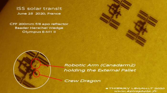 Στις 24 και 25 Ιουνίου ο αστροφωτογράφος Thierry Legault «συνέλαβε» με την κάμερά του το πέρασμα του Διεθνούς Διαστημικού Σταθμού μπροστά από τον Ήλιο. Στις φωτογραφίες διακρίνεται ο ρομποτικός βραχίονας του σταθμού Canadarm2 (μήκους 17,8 m) αλλά και η παρκαρισμένη κάψουλα της SpaceX Dragon: