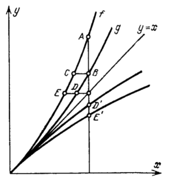 Οι γραφικές παραστάσεις των συναρτήσεων f και g εφάπτονται την ευθεία y=x στην αρχή των αξόνων κσι οι λόγοι |ΑΒ|/|ΒC| και |ΒC|/|ED| τείνουν στη μονάδα καθώς το σημείο Α πλησιάζει στην αρχή των αξόνων, επομένως, δεδομένου ότι |D’E’|=|ED| (εξαιτίας της συμμετρίας των αντίστροφων συναρτήσεων) και το όριο του λόγου |ΑΒ|/|D’E’| ισούται με την μονάδα. Όμως και