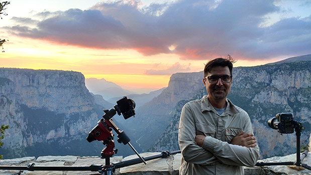 Παθιασμένος με τους ουρανούς, δεν διστάζει να κουβαλήσει 50 κιλά στην πλάτη για να αποτυπώσει τον γαλαξία από την κορυφή του Άθω, να «τραβηχτεί» στην Γκαμπόν και στην Αυστραλία για να φωτογραφίσει ηλιακές εκλείψεις ή να μείνει ξάγρυπνος 8 ημέρες, προκειμένου να εντοπίσει μια έκρηξη σουπερνόβα. «Είμαι παιδί του “Σταρ Τρεκ”. Από μικρός αναζητούσα ποιοι είμαστε και από πού προερχόμαστε, λαμβάνοντας τη συνηθισμένη απάντηση: “Ωχ τώρα, μωρέ, με τι ασχολείσαι”. Η Γη ήταν για μένα πεπερασμένη, αναζητούσα την αλήθεια στον ουρανό και κάπως έτσι πήρα το πρώτο μου τηλεσκόπιο στα 23 μου χρόνια, το 1999, σε μια εποχή που δεν υπήρχε ίντερνετ και σύλλογοι αστρονομίας. Ρωτούσα όποιον έβρισκα μπροστά μου και, τελικά, έλαβα την ιδανική πληροφορία από έναν βενζινοπώλη, ο οποίος μου είπε πως το περιοδικό “Car and Driver” είχε αφιέρωμα στα τηλεσκόπια. Ξεκίνησα παρατηρώντας τον ουρανό, και στην πορεία γνώρισα τον Όμιλο Φίλων Αστρονομίας στη Θεσσαλονίκη, κατασκεύασα ένα πλήρως αυτόνομο αστρονομικό παρατηρητήριο και δημιούργησα μια ομάδα ερευνητών, η οποία εντοπίζει εκρήξεις σουπερνόβα σε μακρινούς γαλαξίες. Καταφέραμε πολλά, από αναγνώριση μέχρι διεθνείς δημοσιεύσεις, αλλά το σημαντικότερο ήταν ότι φέραμε τον κόσμο σε επαφή με τον νυκτερινό ουρανό. Ωστόσο, κι αυτό είχε τους περιορισμούς του. Με την επιστημονική έρευνα κατάλαβα πώς λειτουργεί ο κόσμος. Όμως όταν ήθελα να μεταδώσω τη γνώση, η πληροφορία μέσα από την επιστημονική φωτογραφία γινόταν κάπως βαρετή. Συνειδητοποίησα, λοιπόν, πως μια καλή φωτογραφία που δείχνει τον έναστρο ουρανό και το επίγειο περιβάλλον εμπνέει. Κάνει πιο εύκολη την αποστολή μου να μεταφέρω το μήνυμα πως ο φυσικός μας κόσμος είναι ένας και ενιαίος: ο ουρανός και η γη».