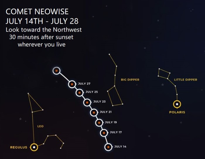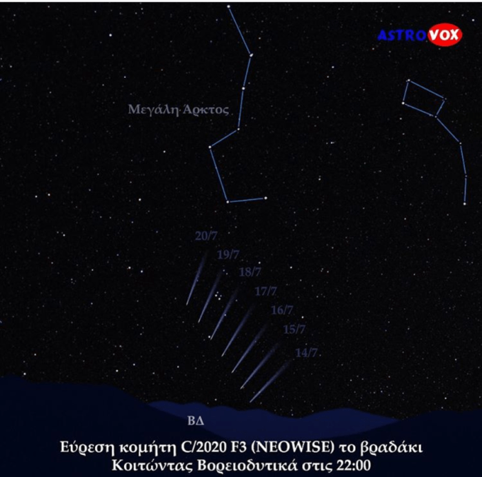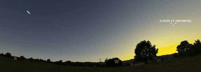 Βορειοδυτικά κοντά στον ορίζοντα εμφανίζεται και ο κομήτης NEOWISE (αν και χάνει την αρχική λαμπρότητά του):