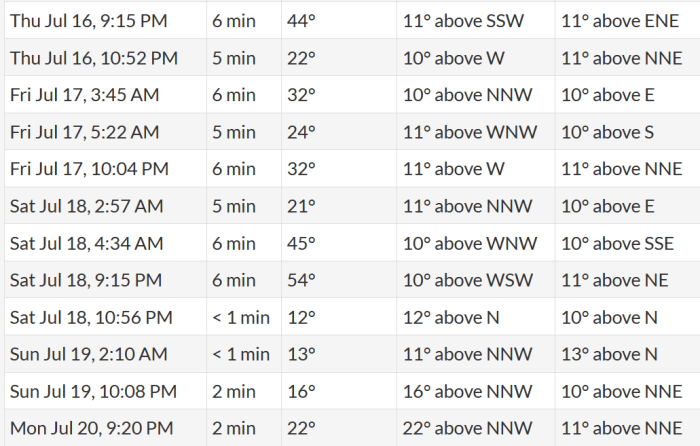 Σήμερα 16 Ιουλίου 2020, στις 9:15 μ.μ. ο Διεθνής Διαστημικός Σταθμός θα είναι ορατός στον ουρανό της Ελλάδας για 6 λεπτά. Θα εμφανιστεί στις 11° νότια νοτιο-δυτικά, θα φτάσει σε μέγιστο ύψος 44°, και θα χαθεί στις 11° ανατολικά-βόρειο-ανατολικά. Το ίδιο βράδυ Θα επανεμφανιστεί στις 10:52 μ.μ., 10° δυτικά, θα φτάσει σε μέγιστο ύψος 22°, και μετά από 5 λεπτά θα εξαφανιστεί στις 11° βόρεια βορειο-ανατολικά.