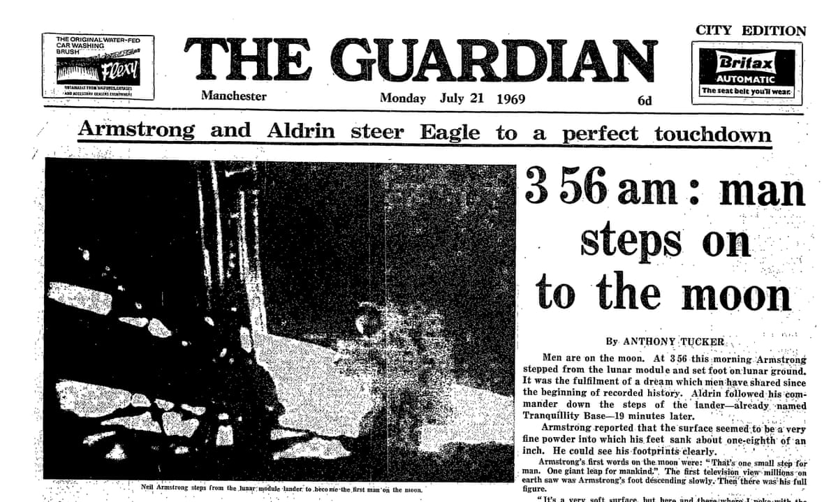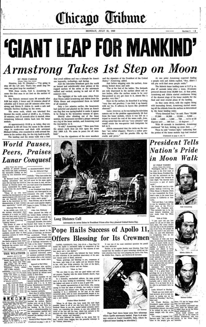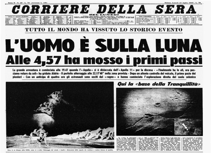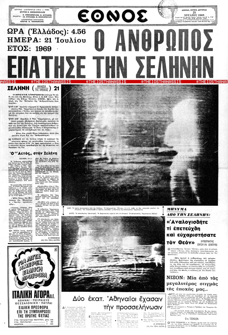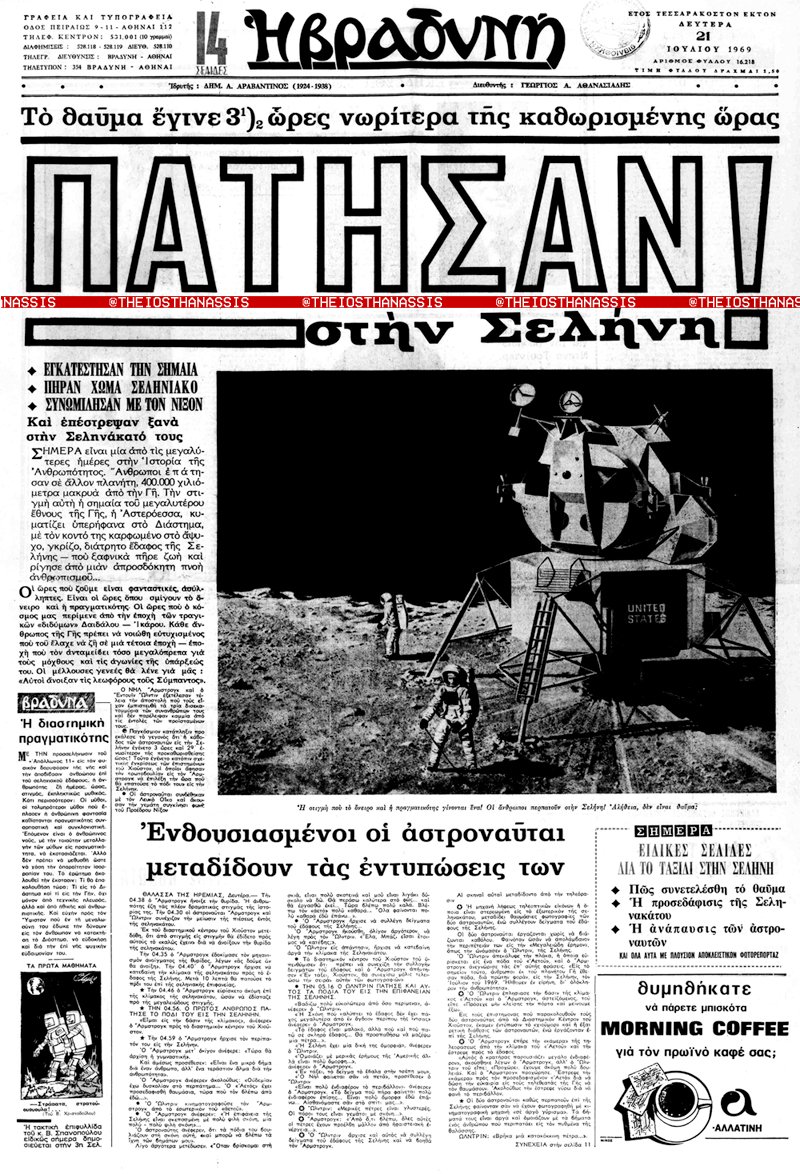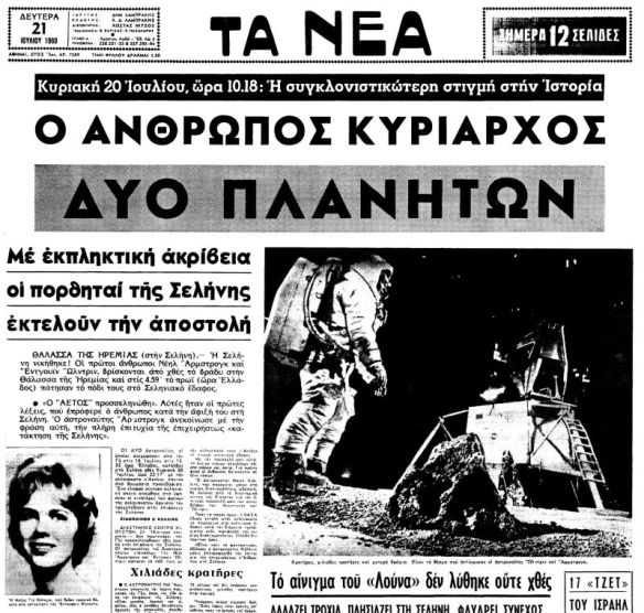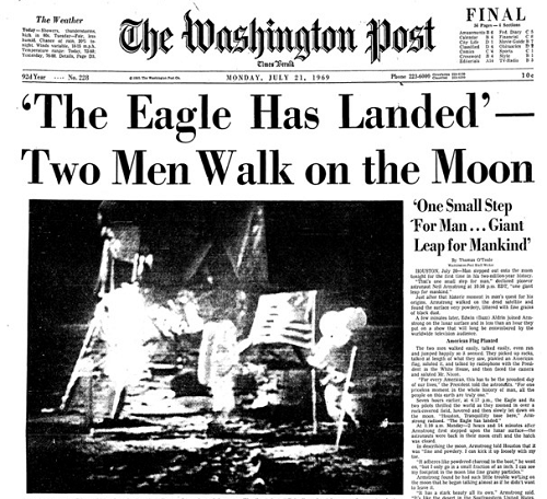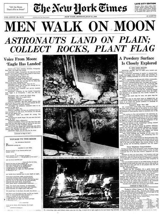 Στις 20 Ιουλίου 1969 τα πρωτοσέλιδα όλων των εφημερίδων του κόσμου φιλοξενούν τη φωτογραφία των πρώτων ανθρώπων που πάτησαν στο φεγγάρι.