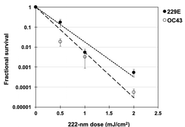 Μικρές δόσεις (1,7 και 1,2 mJ/cm2) υπεριώδους ακτινοβολίας μήκους κύματος 222 nm, «σκοτώνουν» το 99,9% των ιών που περιέχονται στα αιωρούμενα σταγονίδια. Συνεχής έκθεση σε υπεριώδη ακτινοβολία (~3 mJ/cm2/hour) θα είχε ως αποτέλεσμα την εξουδετέρωση του ~ 90% των ιών μέσα σε ~ 8 λεπτά, το 95% σε ~ 11 λεπτά, το 99% σε ~ 16 λεπτά και το 99,9% μέσα σε ~ 25 λεπτά.