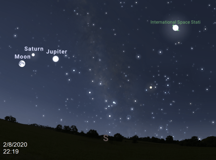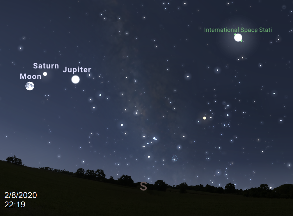 Χτες βράδυ το λαμπερό «αστέρι» κοντά στη Σελήνη ήταν ο πλανήτης Δίας. Απόψε το βράδυ, κοντά στη Σελήνη θα βρίσκεται και ο πλανήτης Κρόνος. Αν μάλιστα μπορείτε να παρατηρήσετε νότια – νοτιοδυτικά τον ουρανό μεταξύ 22:17 και 22:19 θα δείτε και τον Διεθνή Διαστημικό Σταθμό (υπενθυμίζεται ότι φέτος ο ΔΔΣ γιορτάζει τα 30 χρόνια συνεχούς διαβίωσης αστροναυτών σε αυτόν):