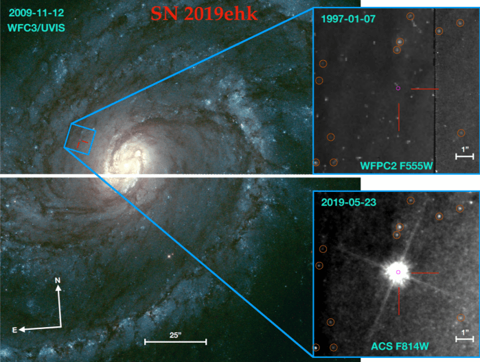 Παρότι το διαστημικό τηλεσκόπιο Hubble παρατηρούσε τον γαλαξία M100 τα τελευταία 25 χρόνια, δεν κατέγραψε ποτέ το άστρο που απεβίωσε διαμέσου της έκρηξης σουπερνόβα SN 2019ehk. Οι ερευνητές έψαξαν τις εικόνες του Hubble για να εξετάσουν την θέση του σουπερνόβα πριν από την έκρηξη, αλλά δεν βρήκαν τίποτε. Εν ολίγοις ούτε το Hubble δεν μπορούσε να το δει. Κι αυτό είναι μια ακόμη ένδειξη για την πραγματική φύση του άστρου. Ήταν πιθανότατα ένας λευκός νάνος ή ένα άστρο με πολύ μικρή μάζα. Γιατί και τα δύο θα ήταν πολύ αμυδρά.