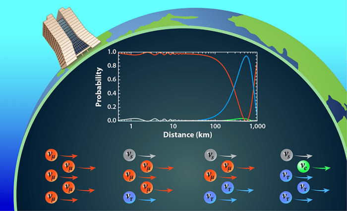 Καθώς τα νετρίνα διασχίζουν την Γη η γεύση τους ταλαντώνεται. Η γραφική παράσταση στο ένθετο της παραπάνω εικόνας δείχνει την πιθανότητα ένα νετρίνο του μιονίου (κόκκινο) που παράγεται στο Fermilab να ταλαντώνεται σε ένα νετρίνο του ταυ (μπλε), ένα νετρίνο του ηλεκτρονίου (πράσινο) ή το υποθετικό στείρο νετρίνο (γκρι).