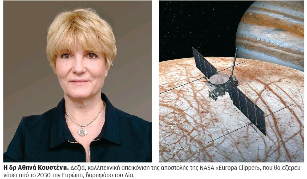 Ομως η δρ Αθηνά Κουστένη, διευθύντρια ερευνών στο Εθνικό Κέντρο Επιστημονικής Ερευνας της Γαλλίας (CNRS) και πρόεδρος της Ευρωπαϊκής Επιτροπής Διαστημικών Επιστημών, δεν είναι κινηματογραφικός ρόλος. Και όλα όσα λέει για την εξερεύνηση του πλανητικού μας συστήματος είναι απολύτως πραγματικά. Αλλωστε, πολλές από τις διαστημικές αποστολές που έχουν πραγματοποιηθεί και άλλες επικείμενες σχεδιάζονται και οργανώνονται από εκείνη.