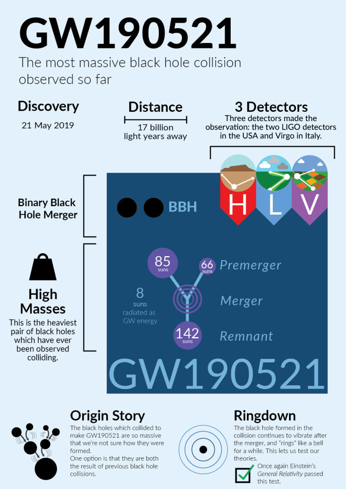 Οι επιστήμονες δημοσίευσαν τα αποτελέσματα της έρευνας του βαρυτικού σήματος (GW190521) στα επιστημονικά περιοδικά Physical Review Letters και Astrophysical Journal Letters. Η μαύρη τρύπα που προέκυψε έχει μάζα όσο 142 ήλιοι, ενώ το σύμπαν «πλημμύρισε» με βαρυτικά κύματα, με ενέργεια ισοδύναμη με οκτώ ήλιους.