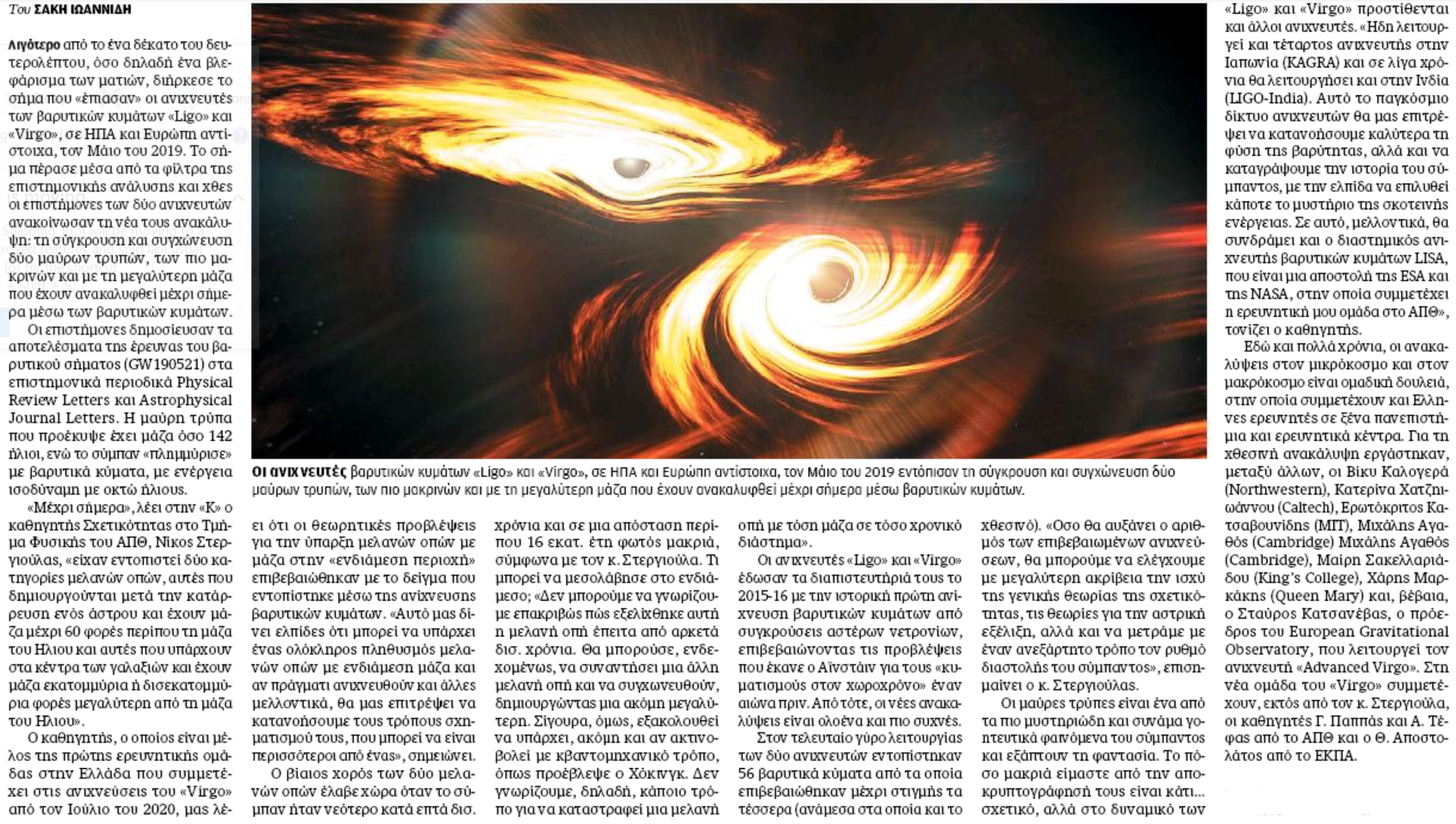 Εδώ και πολλά χρόνια, οι ανακαλύψεις στον μικρόκοσμο και στον μακρόκοσμο είναι ομαδική δουλειά, στην οποία συμμετέχουν και Ελληνες ερευνητές σε ξένα πανεπιστήμια και ερευνητικά κέντρα. Για τη χθεσινή ανακάλυψη εργάστηκαν, μεταξύ άλλων, οι Βίκυ Καλογερά (Northwestern), Κατερίνα Χατζηιωάννου (Caltech), Ερωτόκριτος Κατσαβουνίδης (MIT), Μιχάλης Αγαθός (Cambridge) Μιχάλης Αγαθός (Cambridge), Μαίρη Σακελλαριάδου (King’s College), Χάρης Μαρκάκης (Queen Mary) και, βέβαια, ο Σταύρος Κατσανέβας, ο πρόεδρος του European Gravitational Observatory, που λειτουργεί τον ανιχνευτή «Advanced Virgo». Στη νέα ομάδα του «Virgo» συμμετέχουν, εκτός από τον κ. Στεργιούλα, οι καθηγητές Γ. Παππάς και Α. Τέφας από το ΑΠΘ και ο Θ. Αποστολάτος από το ΕΚΠΑ.