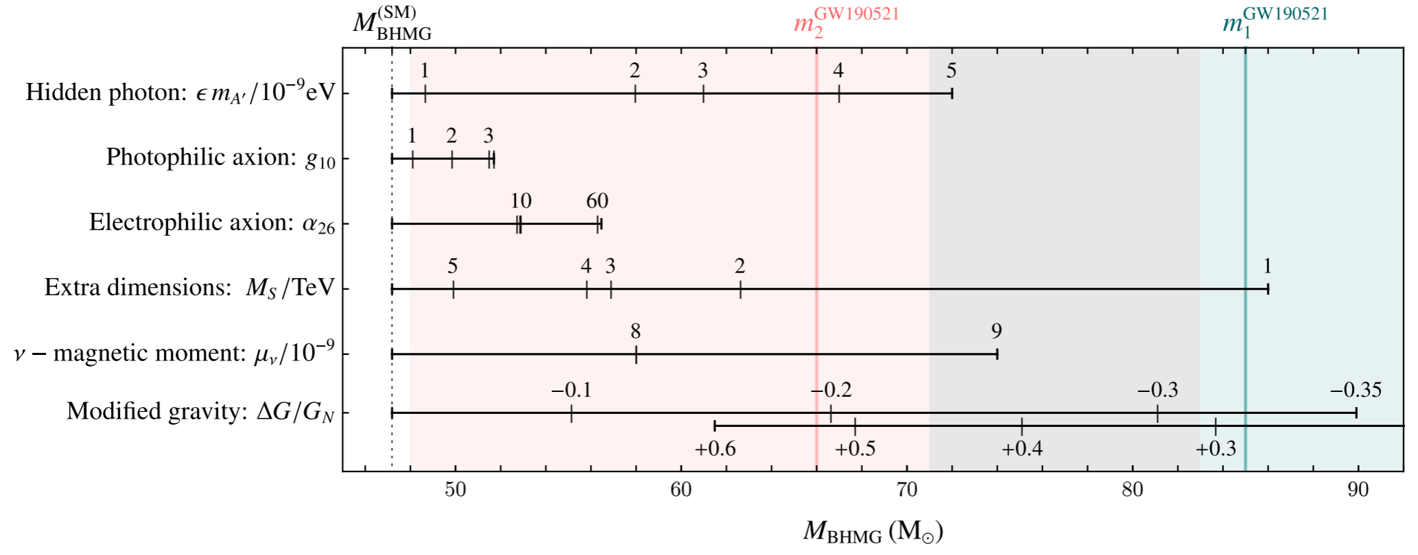 Ένα δεύτερο παράδειγμα αποτελεί η προσχθεσινή δημοσίευση των Sakstein et al, με τίτλο «Beyond the Standard Model Explanations of GW190521». Στην εργασία αυτή επιχειρούν να εξηγήσουν το βαρυτικό σήμα GW190521 χρησιμοποιώντας μοντέλα «νέας φυσικής», θέτοντας περιορισμούς σ’ αυτά, σύμφωνα με τις μάζες των μαύρων τρυπών που συγχωνεύθηκαν.