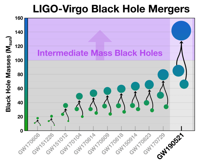 Το GW150914 προέκυψε από την συγχώνευση δυο μαύρων τρυπών με μάζες 66 M⊙ και 85 M⊙ (1M⊙=η μάζα του ήλιου μας), προς τον σχηματισμό μιας νέας μαύρης τρύπας με μάζα περίπου 142M⊙. Η συγχώνευση απελευθέρωσε τεράστια ποσότητα ενέργειας, ισοδύναμη με την ενέργεια 8 ηλιακών μαζών. Οι εξαιρετικά μεγάλες μάζες των μαύρων τρυπών που παρήγαγαν το σήμα GW190521 θέτουν υπό αμφισβήτηση την κατανόησή μας σχετικά με το σχηματισμό μαύρων τρυπών.