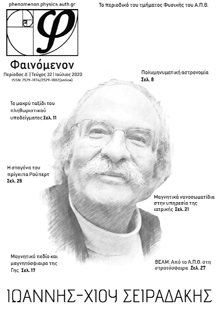 σημείωμα της σύνταξης: Το παρόν τεύχος του «ΦΑΙΝΟΜΕΝΟΝ» περιλαμβάνει άρθρο-αφιέρωμα στον πρόσφατα εκλιπόντα Ι. Χ. Σειραδάκη και άρθρα σχετικά με τις δραστηριότητες φοιτητών του τμήματος. Η ύλη πλαισιώνεται από άρθρα για το μαγνητικό πεδίο της Γης, τους αστεροειδείς και τους μετεωρίτες, την πολυμηνυματική αστρονομία και το πληθωριστικό μοντέλο του σύμπαντος. Παρουσιάζονται επίσης θέματα υλικών και φυσικής στερεάς κατάστασης όπως τα μαγνητικά νανοσωματίδια, υλικά τριβής σε φρένα οχημάτων και γυαλιά διαμορφωμένα σε σχήματα με περίεργες ιδιότητες, ενώ από το τεύχος δεν λείπουν και τα νέα του τμήματος.