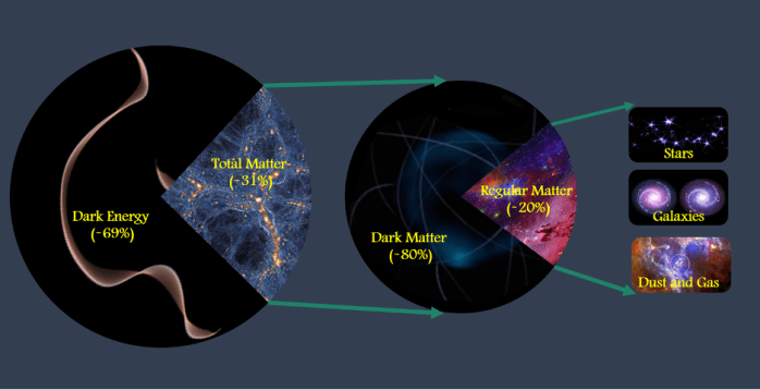Σε σχετική έρευνα που δημοσιεύτηκε στο Astrophysical Journal οι επιστήμονες διαπιστώνουν πως η ύλη αποτελεί το 31% του συνόλου της ύλης και ενέργειας στο σύμπαν μας, με το υπόλοιπο να αποτελείται από σκοτεινή ενέργεια. Όπως είπε ο Μοχάμεντ Αμπντουλάχ, τελειόφοιτος του UCR Department of Physics and Astronomy και πρώτος συντάκτης της έρευνας, εάν όλη η ύλη του σύμπαντος ήταν κατανεμημένη ισόποσα στο διάστημα, θα αντιστοιχούσε σε μια μέση πυκνότητα μάζας αντίστοιχη σε έξι άτομα υδρογόνου ανά κυβικό μέτρο. «Ωστόσο, εφόσον γνωρίζουμε ότι το 80% της ύλης είναι στην πραγματικότητα σκοτεινή ύλη, το μεγαλύτερο μέρος αυτής της ύλης αποτελείται όχι από άτομα υδρογόνου, αλλά από ένα είδος ύλης που οι κοσμολόγοι δεν κατανοούν ακόμα».