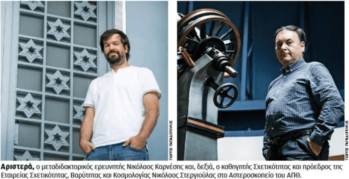 «Εχουμε εξειδίκευση στην πρόβλεψη και ανάλυση παρατηρήσεων των αστέρων νετρονίου. Οταν συγχωνεύονται δύο αστέρες νετρονίου, μπορούμε να αναλύσουμε τις παρατηρήσεις αυτές με σκοπό να καταλάβουμε τι είναι αυτό που βρίσκεται στο κέντρο αυτών των αστέρων. Ενα από τα άλυτα μυστήρια του σύμπαντος είναι πώς συμπεριφέρεται η ύλη στο κέντρο αυτών των αστέρων και μέχρι να το καταλάβουμε δεν θα υπάρξει πρόοδος στη θεωρητική φυσική υψηλών ενεργειών», μας λέει ο κ. Στεργιούλας, ενώ με την άκρη του ματιού του παρακολουθεί την οθόνη του υπολογιστή του με τους φοιτητές που δίνουν τις εξετάσεις του εξαμήνου από απόσταση.