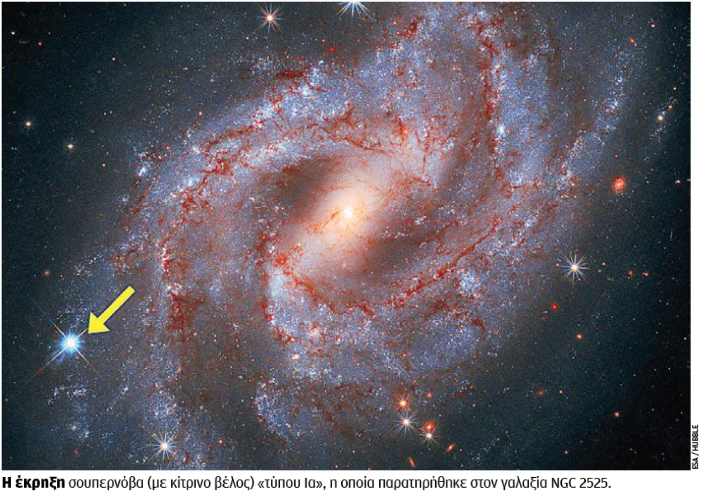 Τον Φεβρουάριο του 2018 και επί ένα χρόνο η ερευνητική ομάδα του νομπελίστα Φυσικής Aνταμ Ρις μελετούσε μία ακόμη έκρηξη σουπερνόβα τύπου Ια, η οποία παρατηρήθηκε στον γαλαξία NGC 2525 που βρίσκεται σε απόσταση 70 εκατομμυρίων ετών φωτός προς την κατεύθυνση του αστερισμού της Πρύμνης. Στα τέλη του περασμένου μήνα η ομάδα του Ρις έδωσε στη δημοσιότητα τα αποτελέσματα της έρευνάς της και μία εξαιρετική αλληλουχία φωτογραφιών που παρουσιάζει την εξέλιξη της φωτεινότητας της σουπερνόβα, η οποία στο μέγιστό της έφτασε να είναι πέντε δισεκατομμύρια φορές λαμπρότερη από τον Ηλιο. Η έρευνα της ομάδας του Ρις προσπαθεί να μελετήσει με μεγαλύτερη ακρίβεια τη συμπεριφορά των σουπερνόβα αυτού του τύπου κι εξ αυτού να βγάλει καλύτερα συμπεράσματα για την ύπαρξη της σκοτεινής ενέργειας που κάνει το σύμπαν να διαστέλλεται επιταχυνόμενο εδώ και δισεκατομμύρια χρόνια, αν και μέχρι τα μέσα της δεκαετίας του 1990, θεωρούσαμε ότι με την πάροδο του χρόνου η διαστολή του σύμπαντος θα έπρεπε να ελαττωνόταν λόγω της βαρύτητας.