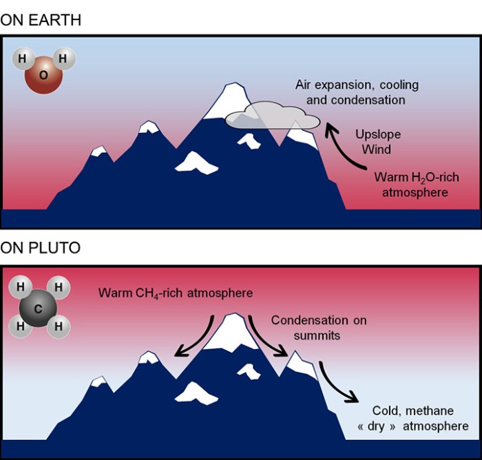 Στην Γη το χιόνι συμπυκνώνονται σε υψόμετρο επειδή μάζες αέρα διαστέλλονται αδιαβατικά κατά την διάρκεια της ανόδου τους στην ατμόσφαιρα και έτσι ψύχονται (με ρυθμό περίπου 1°C ανά 100 m). Στον Πλούτωνα ο πάγος μεθανίου σχηματίζεται στις κορυφές των βουνών όταν είναι αρκετά ψηλά διότι εκεί η ατμόσφαιρά του είναι πλούσια σε μεθάνιο ευνοώντας την συμπύκνωσή του. © Tanguy Bertrand et al.