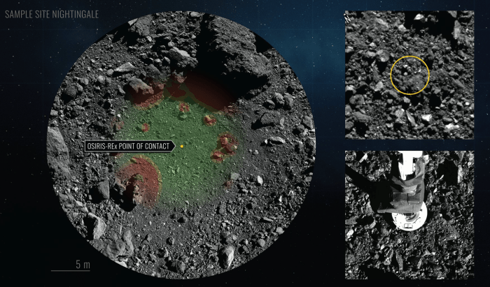 Την περασμένη εβδομάδα, το OSIRIS-Rex πλησίασε τον αστεροειδή Bennu και φύσηξε την επιφάνεια με μια ριπή αέριου αζώτου, η οποία εκτίναξε υλικό της επιφάνειας και το έστειλε σε ένα κάνιστρο συλλογής.