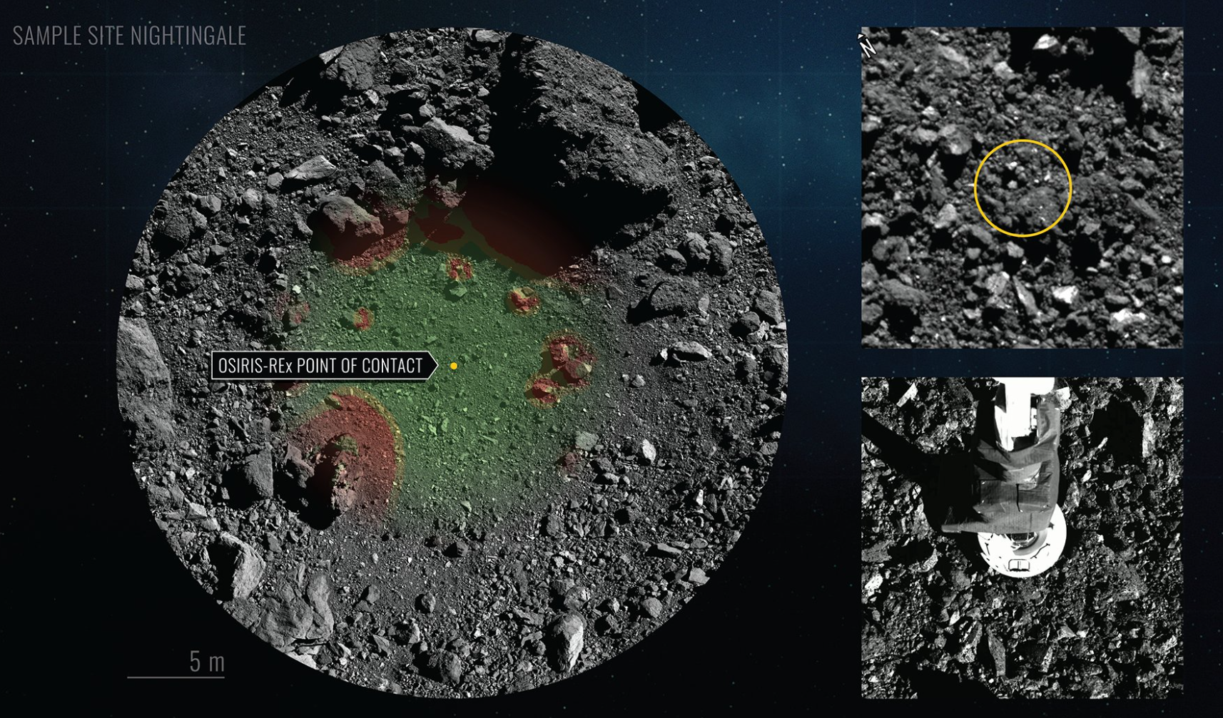 Το σκάφος, που εδώ και καιρό ακολουθούσε κατά πόδας τον αστεροειδή, τον πλησίασε πολύ αργά, ώσπου προσεδαφίστηκε για λίγο σε αυτόν (η επαφή κράτησε μόνο μερικά δευτερόλεπτα), μέσα σε ένα μικρό κρατήρα στο βόρειο ημισφαίριο του Μπενού. Αμέσως εξέτεινε ένα ρομποτικό απορροφητικό βραχίονα μήκους 3,5 μέτρων για τη συλλογή του δείγματος από σκόνη και πέτρες.