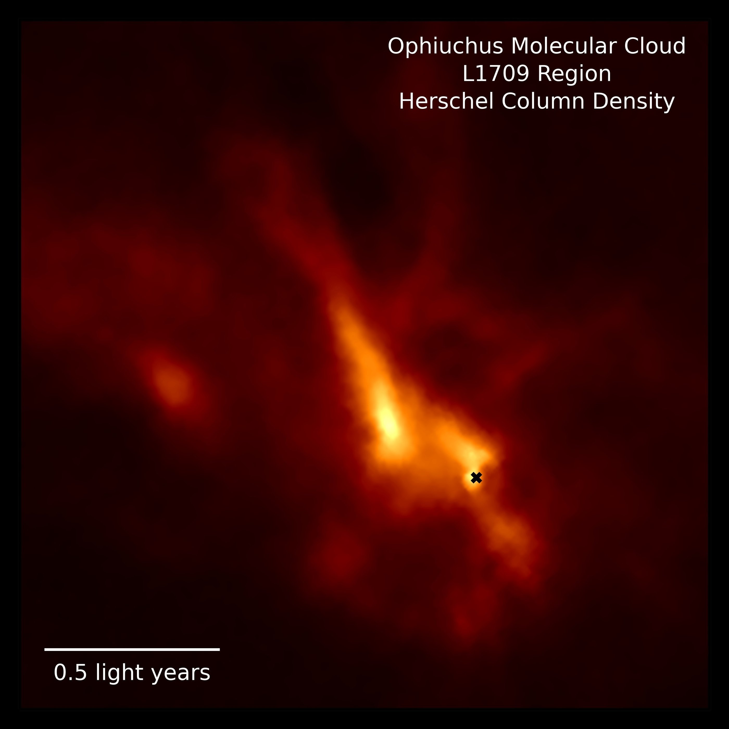 Η πυκνή περιοχή L1709 του μοριακού νέφους στον Οφιούχο χαρτογραφείται από το Διαστημικό Τηλεσκόπιο Herschel