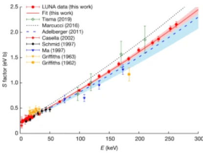 Έτσι, μια ομάδα φυσικών στο υπόγειο εργαστήριο πυρηνικής φυσικής LUNA (Laboratory for Underground Nuclear Astrophysics) στο Gran Sasso μελέτησε την πυρηνική αντίδραση D+p→3He+γ , που αποτελεί μια από τις δυο πρώτες διαδρομές που οδηγούν σε βαρύτερους πυρήνες (μετά το δευτέριο). Μέτρησαν την ενεργό διατομή της σε ένα περιβάλλον απαλλαγμένο από το ενοχλητικό υπόβαθρο της κοσμικής ακτινοβολίας στις κατάλληλες χαμηλές ενέργειας και προσδιόρισαν τον αστροφυσικό παράγοντα με πολύ καλή ακρίβεια.
