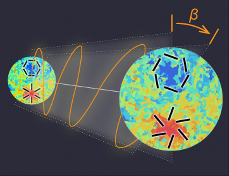Ενδείξεις νέας φυσικής στην πολωμένη ακτινοβολία από το αρχέγονο σύμπαν: Η περιστροφή του επιπέδου πόλωσης του ηλεκτρομαγνητικού κύματος (πορτοκαλί γραμμή) μπορεί να οφείλεται στην σκοτεινή ύλη ή την σκοτεινή ενέργεια. Αυτό φαίνεται ως μεταβολή των μοτίβων της πόλωσης (μαύρες γραμμές). Οι κόκκινες και μπλε περιοχές δείχνουν τις θερμές και ψυχρές περιοχές του κοσμικού υποβάθρου μικροκυμάτων, αντίστοιχα.