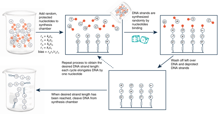 Οι επιστήμονες χρησιμοποίησαν ως αρχική πηγή ένα διάλυμα το οποίο περιείχε όλα τα νουκλεοτίδια τα οποία αποτελούν τους «δομικούς λίθους» του DNA, δηλαδή την αδενίνη, τη θυμίνη, τη γουανίνη και την κυτοσίνη. Παράλληλα χρησιμοποίησαν ένα καλούπι με 64 θέσεις, στις οποίες προσκολλούταν ένα τυχαίο νουκλεοτίδιο τη φορά. Με αυτή τη μέθοδο, η οποία είναι παραπλήσια με τη μέθοδο με την οποία οι βιολόγοι συνθέτουν τεχνητά μόρια DNA, οι ερευνητές πήραν τρία τετράκις εκατομμύρια διαφορετικά τεχνητά μόρια. Έπειτα, προσδιόρισαν την ακριβή αλληλουχία πέντε χιλιάδων μορίων και με τη βοήθεια ενός αλγορίθμου «μετέφρασαν» την αλληλουχία των χημικών βάσεων σε αλληλουχία των ψηφίων 0 και 1, στη γλώσσα δηλαδή των υπολογιστών.