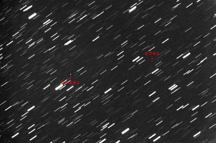 Το διαστημικό σκάφος Hayabusa2 και η κάψουλα που μόλις άφησε να πέσει στη Γη, όπως φαίνονται από τηλεσκόπιο στην Ιαπωνία. Η κάψουλα έχει πλάτος περίπου μισό μέτρο και βρισκόταν 160.000 χιλιόμετρα μακριά! Το τηλεσκόπιο ακολουθούσε την κίνηση του Hayabusa2, και γι’ αυτό τα άστρα στο υπόβαθρο φαίνονται να κινούνται. https://www.city.tottori.lg.jp/www/contents/1607165119585/index.html