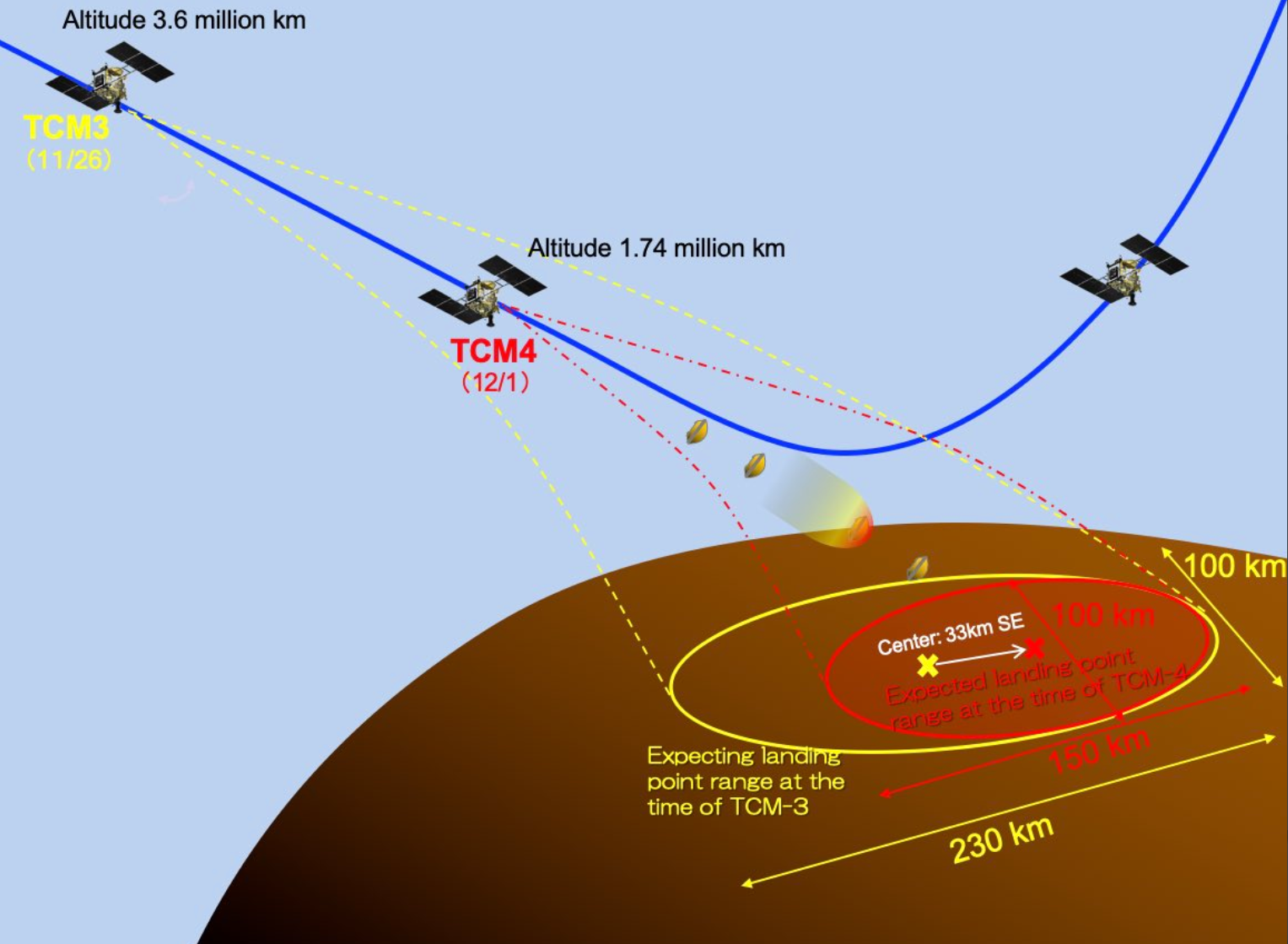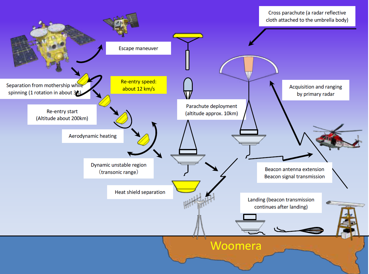 Η Ιαπωνική Υπηρεσία Αεροδιαστημικής Έρευνας (JAXA) σχεδιάζει να ρίξει την κάψουλα με τα δείγματα σε μια απομακρυσμένη, αραιοκατοικημένη περιοχή της Αυστραλίας, – κάτι που αποτελεί μεγάλη πρόκληση και απαιτεί υψηλό βαθμό ελέγχου και ακριβείας. Η κάψουλα, που προστατεύεται από μια θερμική ασπίδα, θα μετατραπεί σε μια πύρινη σφαίρα κατά τη διάρκεια της εισόδου στην ατμόσφαιρα, στα 200 χλμ από το έδαφος. Σε απόσταση 10 χλμ. από το έδαφος θα ανοίξει αλεξίπτωτο για να προετοιμαστεί για προσγείωση, και θα σταλούν σήματα για να υποδείξουν τη θέση της.