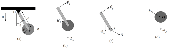 (a) Εκκρεμές που αποτελείται από έναν δίσκο και μια ράβδο (b) Οι εξωτερικές δυνάμεις που δρουν στο άκαμπτο σύστημα ράβδου-δίσκου (ο δίσκος είναι πακτωμένος με τη ράβδο). Στα (c) και (d) βλέπουμε τις δυνάμεις που ασκούνται στον δίσκο και τη ράβδο αντίστοιχα. Η αλληλεπίδραση μεταξύ ράβδου και δίσκου παριστάνεται με την δύναμη Ν και την ροπή τ.