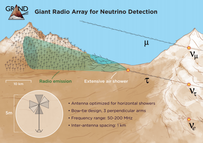 Από τους τρεις τύπους νετρίνων των κοσμικών ακτίνων υπερ-υψηλής ενέργειας, το νετρίνο του ηλεκτρονίου απλά ‘κολλάει’ στην συνηθισμένη ύλη με την οποία αλληλεπιδρά, ενώ το νετρίνο του μιονίου συνεχίζει να ταξιδεύει μέσω της συνηθισμένης ύλης ακόμα και αν αλληλεπιδρά με αυτή. Οι πειραματικοί ενδιαφέρονται για το νετρίνο του ταυ γιατί αλληλεπιδρά με την συνηθισμένη ύλη και διασπάται αφού διανύσει περίπου 50 km από το σημείο αλληλεπίδρασης. Η συστοιχία τηλεσκοπίων GRAND θα βρίσκεται σε κατάλληλα επιλεγμένη θέση για να ανιχνεύει αυτή τη διάσπαση (που περιγράφεται από τον όρο “air shower”) από το ραδιοφωνικό σήμα που δημιουργεί.
