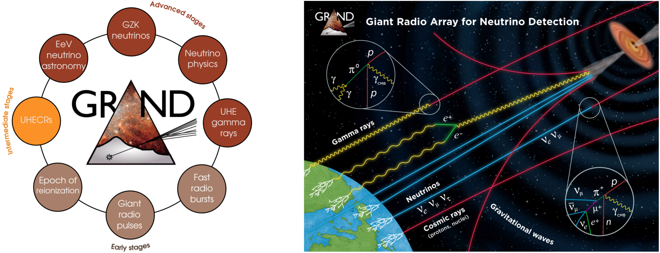 Εκτός από τον πρωταρχικό στόχο της ανίχνευσης νετρίνων υπερ-υψηλής ενέργειας, τα ραδιοτηλεσκόπια GRAND θα μπορούσαν να χρησιμοποιηθούν και για άλλες αστροφυσικές αναζητήσεις: π.χ. ανίχνευση ταχέων ραδιοφωνικών εκρήξεων, διερεύνηση της κοσμολογικής εποχής του επανιονισμού κ.λπ., όπως δείχνει το παραπάνω διάγραμμα (αριστερά).