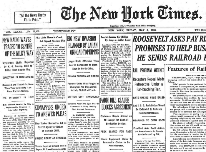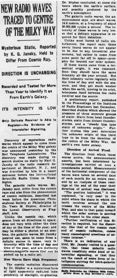 Οι New York Times έκαναν πρωτοσέλιδο την ανακάλυψη του Τζάνσκι στις 5 Μαΐου του 1933, όμως, οι αστρονόμοι της εποχής δεν «τσίμπησαν»: αισθάνονταν πιο άνετα με φακούς και κάτοπτρα. Έπειτα ήρθε ο πόλεμος και από τη δεκαετία του ’50 κι έπειτα η αστρονομία «εκτοξεύθηκε» με τα ραδιοτηλεσκόπια.