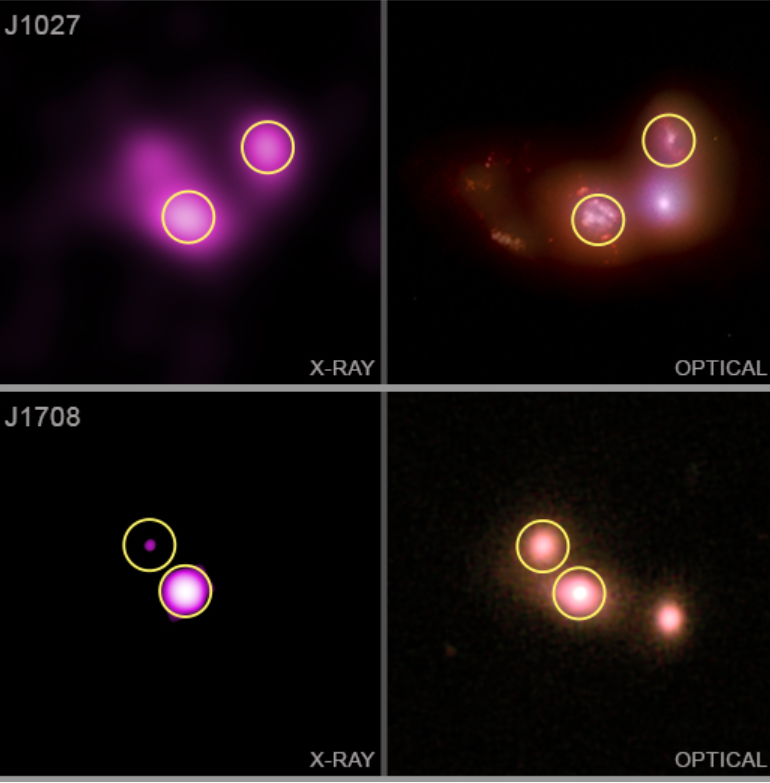 Οι παραπάνω εικόνες δείχνουν δυο από τις επτά (τριπλές) γαλαξιακές συγκρούσεις που μελετήθηκαν. Αριστερά φαίνονται οι συγχωνεύσεις στις ακτίνες Χ του Chanda και δεξιά όπως τις βλέπουν στο ορατό φως τα τηλεσκόπια Ηubble και Sloan Digital Sky Survey. Οι κύκλοι δείχνουν την ακτινοβολία από το θερμό αέριο που πέφτει σε κάθε μαύρη τρύπα.