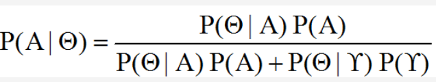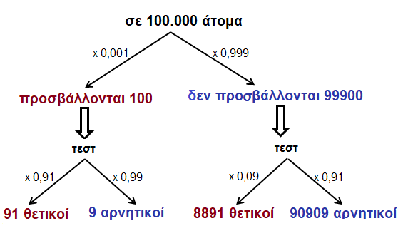 Το ίδιο αποτέλεσμα προκύπτει αν εφαρμόσουμε απευθείας το θεώρημα του Bayes (βλέπε λεπτομέρειες ΕΔΩ) θέτοντας: Ρ(Α) = 0,001 , Ρ(Υ) = 0,999  ,  Ρ(Θ|Α) = 0,91  και  Ρ(Θ|Υ) = 0,09.