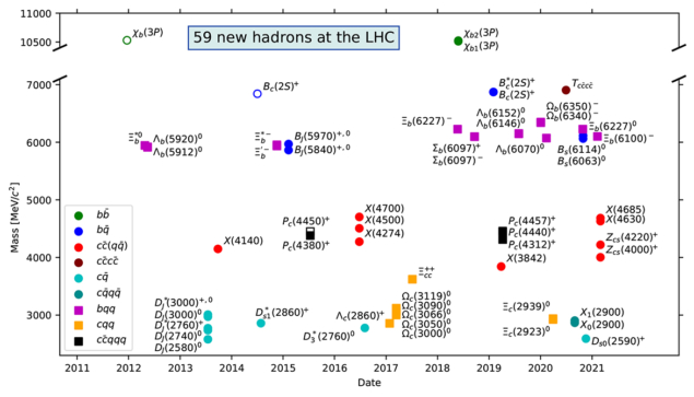 Οι τρεις ερευνητικές ομάδες του CERN, ATLAS, CMS και LHCb έχουν ανακαλύψει την τελευταία δεκαετία τις 59 αδρονικές καταστάσεις που περιλαμβάνει ο παρακάτω πίνακας. Οι τελευταίες τέσσερις είναι τα τετρακουάρκ που αναφέρονται στην πρόσφατη δημοσίευση του LHCb με τίτλο «Observation of new resonances decaying to J/ψK+ and J/ψφ» .