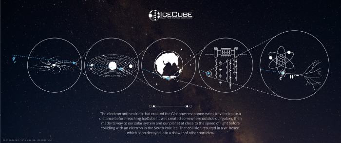 Το αντινετρίνο του ηλεκτρονίου το οποίο δημιούργησε το γεγονός του συντονισμού Glashow έφτασε από πολύ μακριά πριν φτάσει στο IceCube. Στο παραπάνω γράφημα (χωρίς κλίμακα) η μπλέ διακεκομμένη γραμμή δείχνει την διαδρομή του αντινετρίνου .