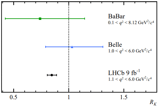 . Ενώ, σύμφωνα με το Καθιερωμένο Πρότυπο των στοιχειωδών σωματιδίων είναι εξίσου πιθανό να διασπαστούν σε ηλεκτρόνια ή μιόνια, τα αποτελέσματα των αναλύσεων δείχνουν ότι η φύση προτιμά τα ηλεκτρόνια από τα βαρύτερα μιόνια. Έτσι, η τιμή του λόγου RK βρέθηκε μικρότερη της μονάδας: