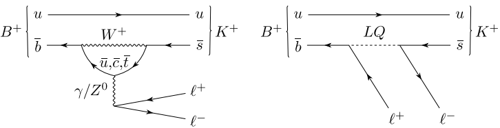 Τα ασταθή φορτισμένα αδρόνια B+ (που αποτελούνται από τα κουάρκ u και ), διασπώνται σε φορτισμένα καόνια και φορτισμένα λεπτόνια