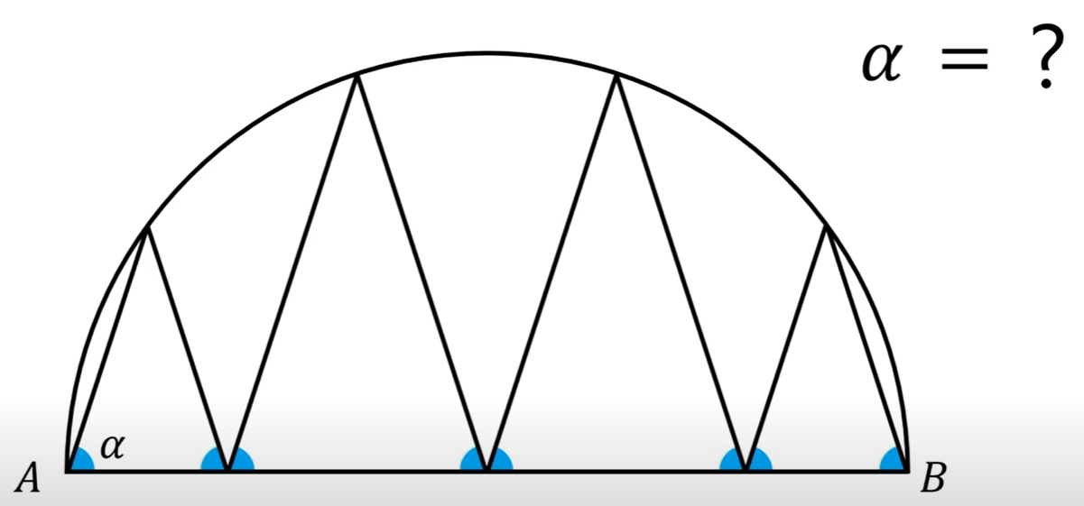 Οι σκιασμένες με μπλε γωνίες του παραπάνω εγγεγραμμένου σε ημικύκλιο πριονωτού σχήματος είναι ίσες με α. Μπορείτε να προσδιορίσετε την γωνία α;