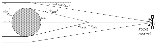 Αντίθετα με έναν συνηθισμένο φακό, ένας βαρυτικός φακός εκτρέπει (πολύ) περισσότερο το φως που περνά πιο κοντά από το κέντρο του και (πολύ) λιγότερο το φως που περνά πιο μακριά από αυτό. Κατά συνέπεια δεν έχει μοναδικό σημείο ως εστία, αλλά μία γραμμή (εστιακή γραμμή). Ο όρος «φακός» για τη βαρυτική κάμψη των φωτεινών ακτίνων χρησιμοποιήθηκε για πρώτη φορά από τον O.J. Lodge, ο οποίος σχολίασε ότι «δεν είναι σωστό να λέμε ότι το ηλιακό βαρυτικό πεδίο δρα ως φακός, διότι δεν έχει εστιακή απόσταση». Σύμφωνα με τον Claudio Maccone αν στείλουμε ένα κατάλληλα εξοπλισμένο διαστημικό σκάφος κατά μήκος οποιασδήποτε ακτινικής κατεύθυνσης μακριά από τον Ήλιο έως την ελάχιστη απόσταση των 550 AU και πέραν, η μάζα του Ήλιου θα λειτουργήσει ως ένας τεράστιος μεγεθυντικός φακός ραδιοκυμάτων, επιτρέποντάς μας να «δούμε» στην άλλη πλευρά του Ήλιου, ακόμη και σε πολύ μεγάλες αποστάσεις.