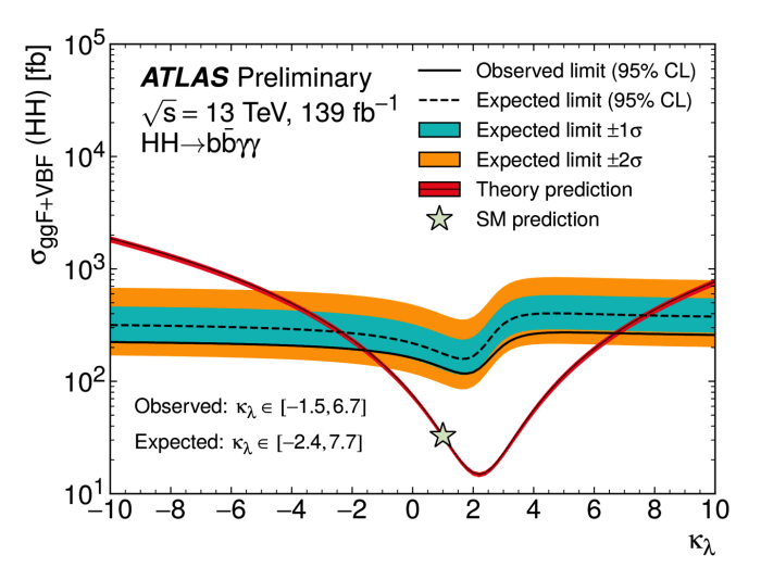 Οι φυσικοί έχουν εισάγει τον παράγοντα κλ, που μας δείχνει αν η αυτο-σύζευξη Higgs διαφέρει από την πρόβλεψη του Καθιερωμένου Προτύπου. Οι παλαιότερες αναζητήσεις ζευγών HH του ATLAS περιόριζε την τιμή κλ μεταξύ -5,0 και +12,1. Χρησιμοποιώντας τις νέες τεχνικές, το τελευταίο αποτέλεσμα του ATLAS είναι υπερδιπλάσιό σε σχέση με το προηγούμενο αποτέλεσμα στο ίδιο κανάλι! Το Σχήμα 2 δείχνει όρια στην πιθανότητα παραγωγής ζευγών HH (ενεργός διατομή σ) ως συνάρτηση του κλ. Το επιτρεπόμενο εύρος για την αυτοσύζευξη Higgs φαίνεται από την τομή του παρατηρούμενου εύρους των τιμών κλ με την θεωρητική πρόβλεψη, μεταξύ -1,5 και 6,7 φορές της πρόβλεψης του Πρότυπου Μοντέλου. Οι φυσικοί μπόρεσαν να θέσουν ένα όριο στην ενεργό διατομή παραγωγής ζευγών HH 4,1 φορές μεγαλύτερη από την πρόβλεψη του Καθιερωμένου Προτύπου. Ορίζονται επίσης όρια στην παραγωγή ΗΗ μέσω της διάσπασης ενός υποθετικού νέου βαθμωτού σωματιδίου. Αν και αυτό το αποτέλεσμα θέτει τα καλύτερα όρια για το μέγεθος της αυτο-σύζευξης Higgs, η εργασία δεν έχει ολοκληρωθεί. Απαιτούνται πολύ περισσότερα δεδομένα για τον ακριβή προσδιορισμό της για να δούμε αν υπάρχει οριστική συμφωνία με την πρόβλεψη της καθιερωμένης θεωρίας. Κι αυτό θα γίνει, δεδομένης της σχεδιαζόμενης αναβάθμισης του LHC, από την οποία θα προκύψει ένα σύνολο δεδομένων 20 φορές μεγαλύτερο από αυτό που χρησιμοποιήθηκε μέχρι σήμερα. Και αν η παραγωγή ζευγών HH συμπεριφέρεται όπως προβλέπει το Καθιερωμένο Πρότυπο, θα διαπιστωθεί μέσα από αυτό το τεράστιο σύνολο δεδομένων.
