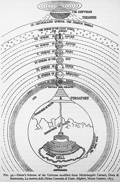 Όσο απίστευτο κι αν ακούγεται, η ίδια ιδέα είχε ήδη συλληφθεί από μια άλλη μεγαλοφυία, σε ένα εντελώς διαφορετικό πολιτισμικό σύμπαν: τον Δάντη, τον μεγαλύτερο ποιητή της Ιταλίας. Το ποίημα του «Θεία Κωμωδία» χωρίζεται σε τρία κύρια μέρη Κόλαση, Καθαρτήριο και Παράδεισος (μια αξιοσημείωτη λεπτομέρεια είναι ότι κάθε κύριο μέρος κλείνει με τη λέξη άστρα). Στον Παράδεισο, το τρίτο μέρος του επικού ποιήματός του, ο Δάντης παρουσιάζει ένα μεγαλειώδες όραμα του μεσαιωνικού κόσμου, βασισμένο στον Αριστοτέλη, με την σφαιρική Γη στο κέντρο του, περιβαλλόμενη από τις ουράνιες σφαίρες.