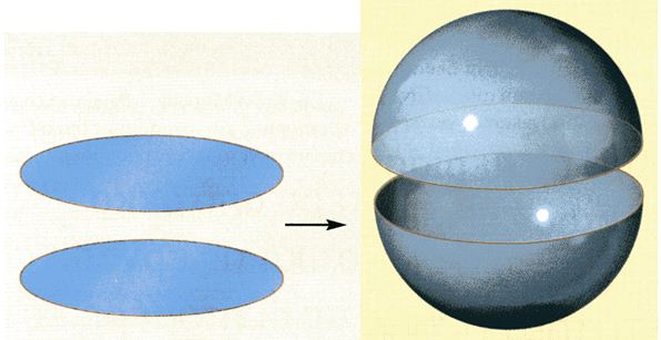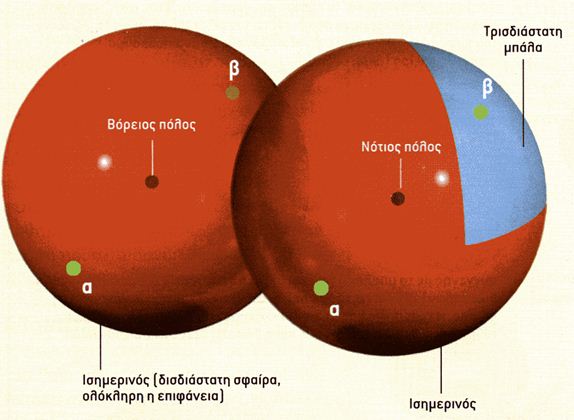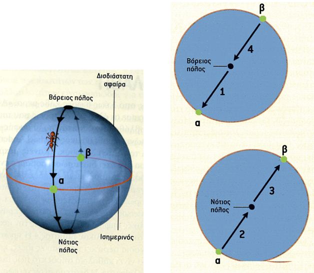 (Αριστερά) Θεωρούμε την οικεία μας δισδιάστατη σφαίρα. Φανταζόμαστε ένα μυρμήγκι που ξεκινά από τον βόρειο πόλο και περπατά κατά μήκος ενός μέγιστου κύκλου, περνά από τον νότιο πόλο και επιστρέφει στην αφετηρία του. Σύμφωνα με το σχήμα 2, η δισδιάστατη σφαίρα προέκυψε από την παραμόρφωση δύο αρχικών δίσκων. Αν απεικονίσουμε την προηγούμενη διαδρομή του μυρμηγκιού πάνω στους αρχικούς δίσκους