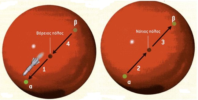 (Δεξιά), παρατηρούμε ότι το μυρμήγκι ταξιδεύει κατά μήκος μιας ευθείας γραμμής [1] με κατεύθυνση από το κέντρο προς την περιφέρεια του ‘βόρειου’ δίσκου [α]. Ακολούθως τη διασχίζει περνώντας στο σημείο που αντιστοιχεί στον ‘νότιο’ δίσκο, τον οποίο διατρέχει σε ευθεία γραμμή [2 και 3]. Όταν ξαναφθάσει στην περιφέρεια (του ‘νότιου’ δίσκου αυτή τη φορά, [β]), την ξαναπερνά και επιστρέφει πάλι στον δίσκο που αντιστοιχεί στο βόρειο ημισφαίριο, όπου συνεχίζει το ταξίδι του επιστρέφοντας τελικά στην αφετηρία του στον σημείο[4]. Ακολουθήσαμε την διαδρομή του μυρμηγκιού καθώς πραγματοποιούσε τον περίπλου της δισδιάστατης σφαίρας παρακολουθώντας συγχρόνως την πορεία που διέγραφε πάνω στους δίσκους. Το μόνο σημείο που χρειάζεται προσοχή είναι ότι η κατεύθυνση της κίνησης φαίνεται να αντιστρέφεται κατά το πέρασμα από τον έναν δίσκο στον άλλο. [Αναλογιστείτε κάποιον που διασχίζει τον ισημερινό της Γης και μετατρέπει το βόρειο και νότιο ημισφαίριο σε δίσκους]