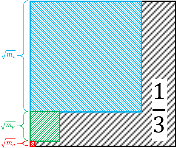 Αυτή είναι η σχέση του Koide, μια ανεξήγητη εμπειρική εξίσωση που ανακάλυψε το 1981 ο Yoshio Koide. Παρατηρείστε ότι η τιμή 2/3 είναι ο μέσος όρος των ακραίων τιμών της ποσότητας Q.
