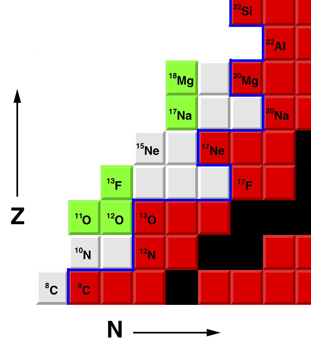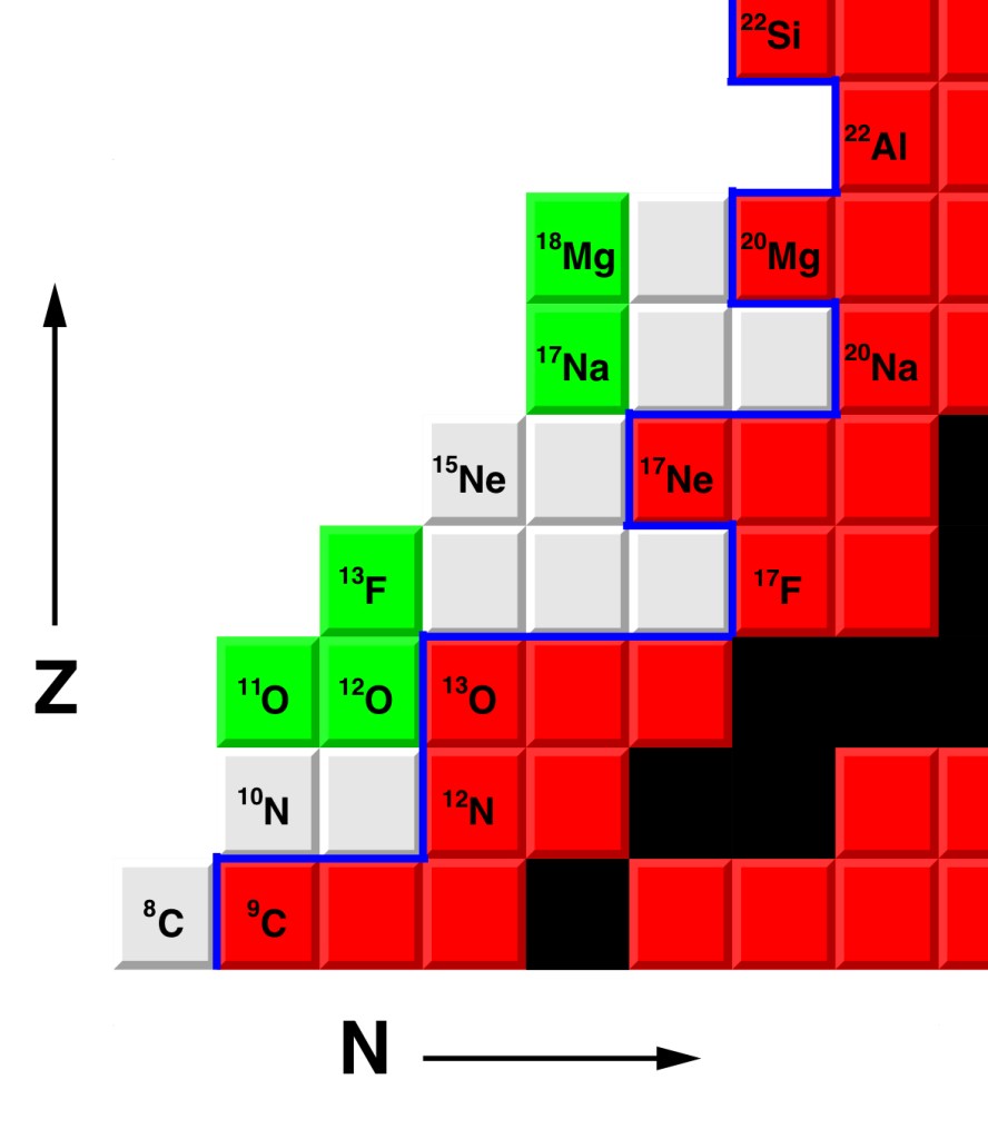 Η μελέτη εξωτικών πυρήνων με τόσο μεγάλες διαφορές νετρονίων ή πρωτονίων έχει σημαντικό ενδιαφέρον για την κατανόηση της σύνθεσης των στοιχείων, παρόλο που η διάρκεια ζωής τους είναι εξαιρετικά μικρή. Πολλά από αυτά τα ισότοπα έχουν εξωτικές ιδιότητες. Το νέο ισότοπο του φθορίου13F, διαθέτει μόνο τέσσερα νετρόνια από τη γραμμή (σε σχέση με τα 10 νετρόνια που διαθέτει το σταθερό ισότοπο 19F) και βρίσκεται το όριο που καθορίζει την ζώνη πέρα από την οποία οι πυρήνες διασπώνται με την εκπομπή ενός πρωτονίου.