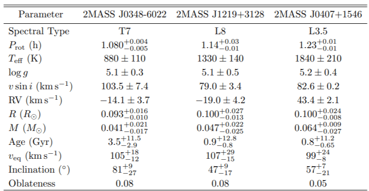 Αυτοί οι καφέ νάνοι εκτελούν μία περιστροφή ανά 1,08, 1,14 και 1,23 ώρες, αντίστοιχα, ενώ άλλοι γνωστοί καφέ νάνοι εκτελούν μία περιστροφή ανά 1,4 ώρες και ο Δίας μία περιστροφή ανά 10 ώρες. Πρόκειται για τους καφέ νάνους που περιστρέφονται με τις μέγιστες δυνατές ταχύτητες, οι οποίες αν ήταν λίγο μεγαλύτερες θα διαλύονταν.