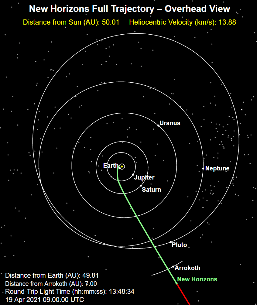 Έχοντας τους Arrokoth και Πλούτωνα σταθερά στον καθρέφτη του, το διαστημικό σκάφος New Horizons πριν από δυο ημέρες ξεπέρασε την απόσταση ορόσημο, τις 50 αστρονομικές μονάδες (ΑU) από τον Ήλιο (1 AU=η μέση απόσταση Γης-Ήλιου=150 εκατομμύρια χιλιόμετρα).