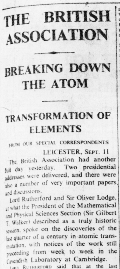 Σύμφωνα με το φύλλο της 11ης Σεπτεμβρίου του 1933 των Times του Λονδίνου, έδωσε μια διάλεξη στο Λέστερ σχετικά με τον μετασχηματισμό των στοιχείων. Στην ομιλία του ο Rutherford αναφέρθηκε και στην εργασία των John Cockcroft και Ernest Walton σχετικά με την διάσπαση του λιθίου σε σωματίδια άλφα μετά από βομβαρδισμό με πρωτόνια στον επιταχυντή σωματιδίων που είχαν κατασκευάσει. Ο Rutherford αναγνώρισε ότι η ενέργεια που απελευθερώνεται σ’ αυτή τη διαδικασία ήταν μεν τεράστια, αλλά θεωρούσε ότι ήταν αδύνατον να εκμεταλλευτούμε αυτή την ενέργεια, δηλώνοντας ότι: «πρόκειται για έναν πολύ φτωχό και αναποτελεσματικό τρόπο παραγωγής ενέργειας και όποιος ψάχνει για μια πηγή ενέργειας στην διάσπαση των ατόμων λέει ανοησίες» .